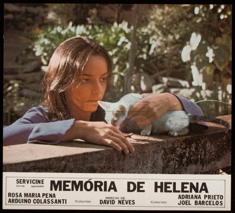 Por fim, também condenada é Helena, do amplamente detestado Memória de Helena, de David Neves. Minha preferência talvez esteja simplesmente no tema “memória” – e nos incontáveis gatinhos que enchem as imagens em Super-8 de Helena. Retomo minha frase preferida de Janet Malcolm em “Still Pictures” (cuja tradução será lançada amanhã (20) pela Companhia das Letras): “The gold is dross. The glitter of memory may be no less deceptive. The past is a country that issues no visas. We can only enter it illegally.” Como no livro de Malcolm, o filme roteirizado por Paulo Emílio Salles Gomes se constrói a partir de registros feitos pela protagonista e seus amigos e familiares durante a adolescência.